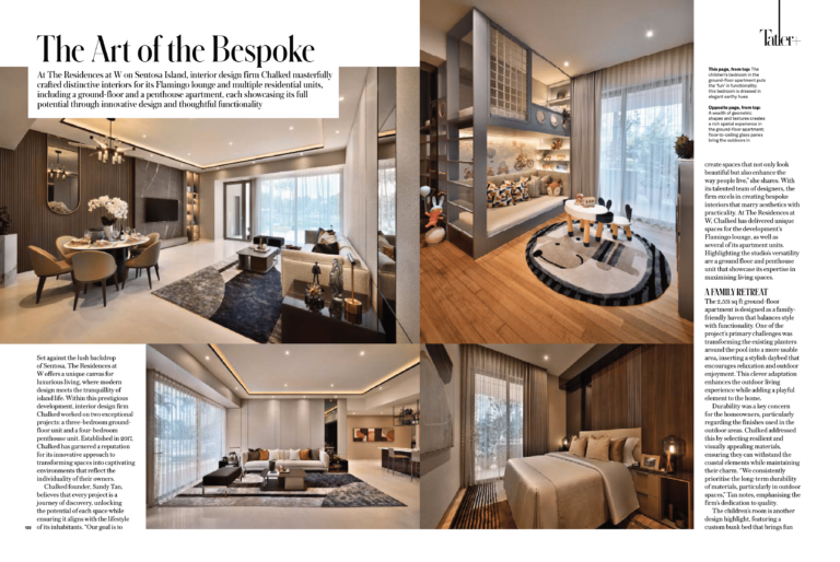At The Residences at W on Sentosa Island, interior design firm Chalked masterfully crafted distinctive interiors for its Flamingo lounge and multiple residential units, including a ground-floor and a penthouse apartment, each showcasing its full potential through innovative design and thoughtful functionality.