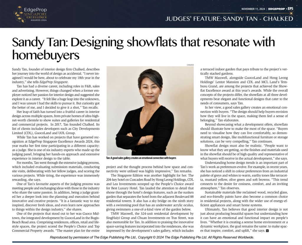 Sandy Tan, founder of interior design firm Chalked, describes her journey into the world of design as accidental. “I never imagined I would be here, about to celebrate my 18th year in the industry,” she tells EdgeProp Singapore.