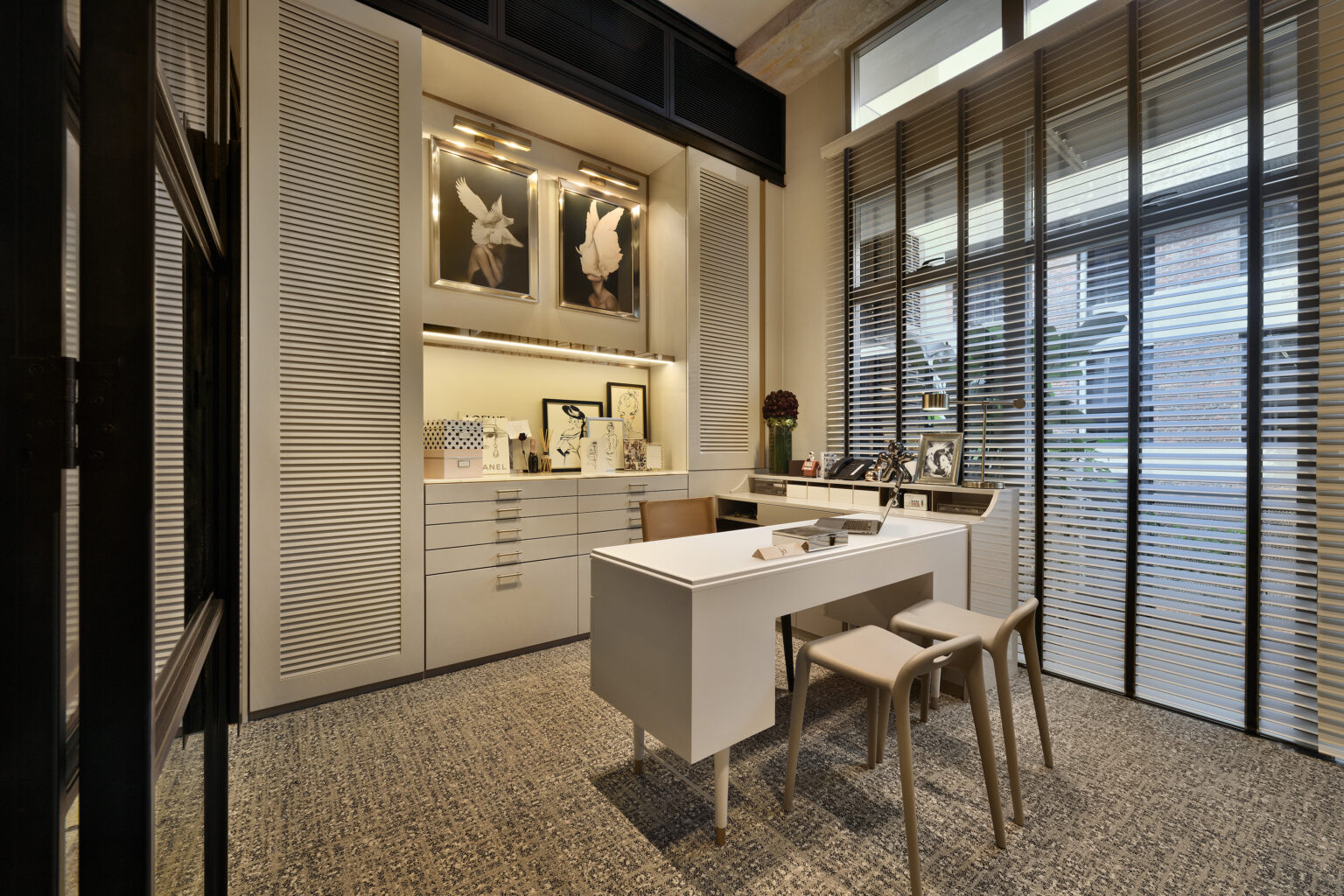 The vision for our office was to create a space that welcomes our clients and reflects our aesthetic point of view. Conceptualised from the group up, we even built a mezzanine above the guest lounge and designed a fully customised metal framework room divider to differentiate between the public and private areas.