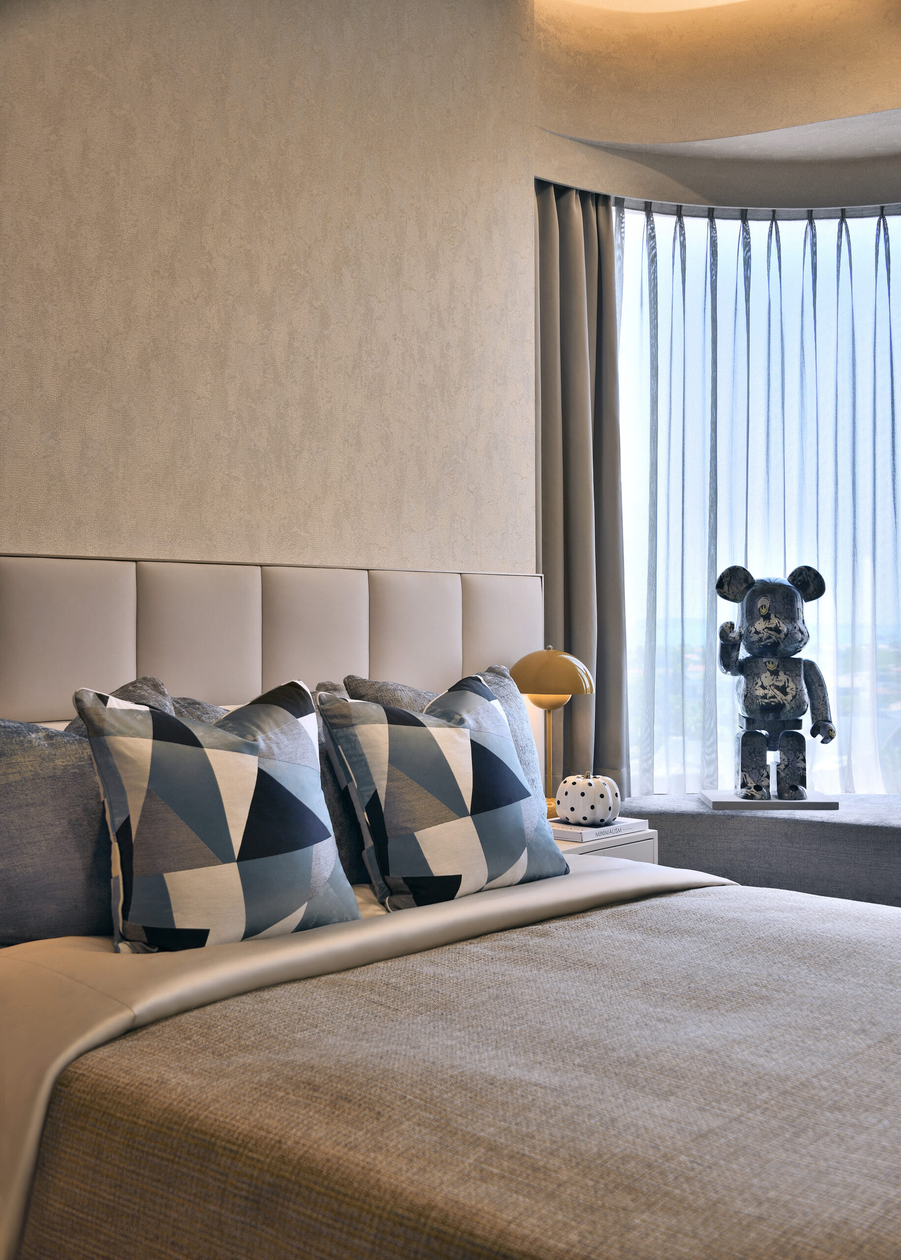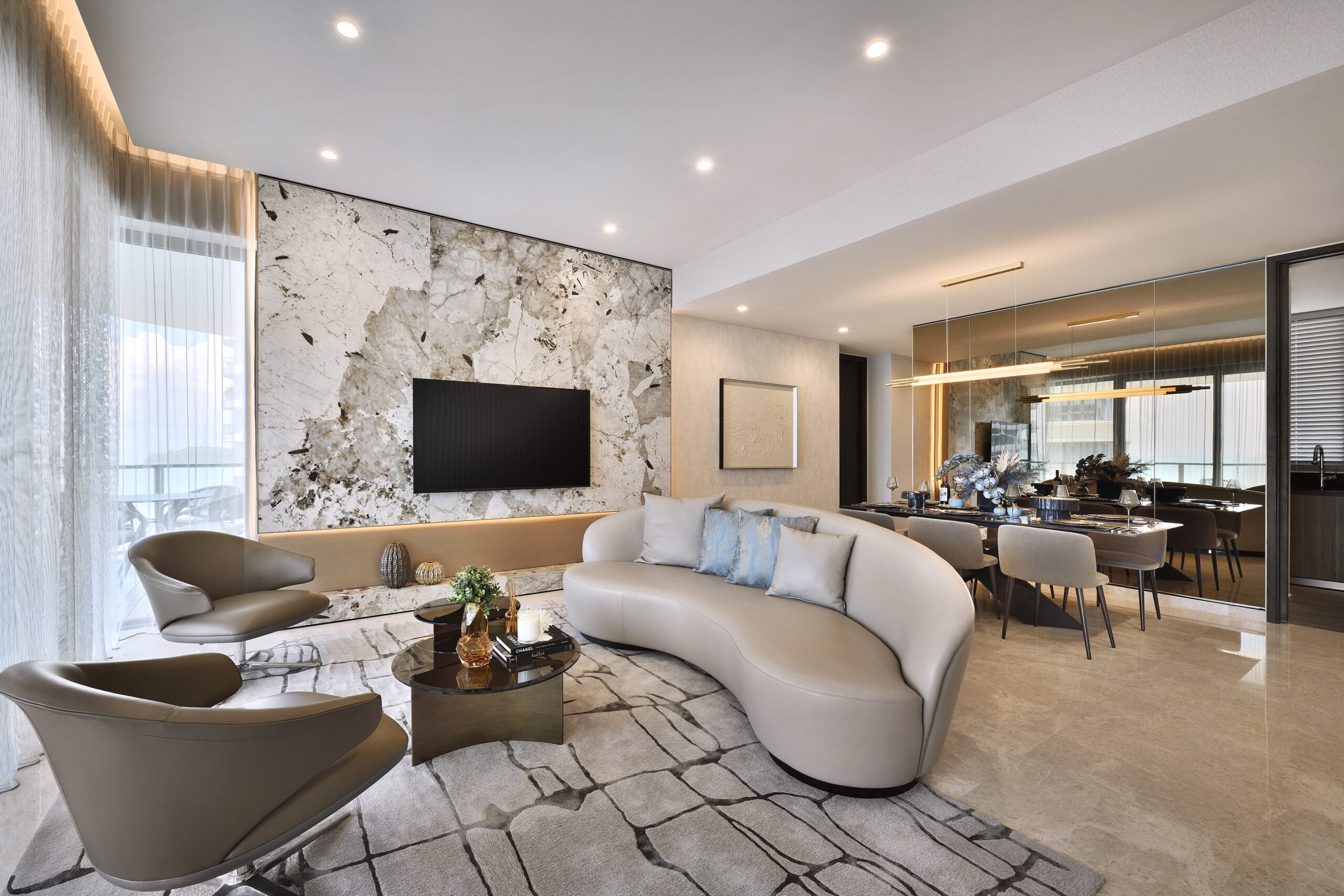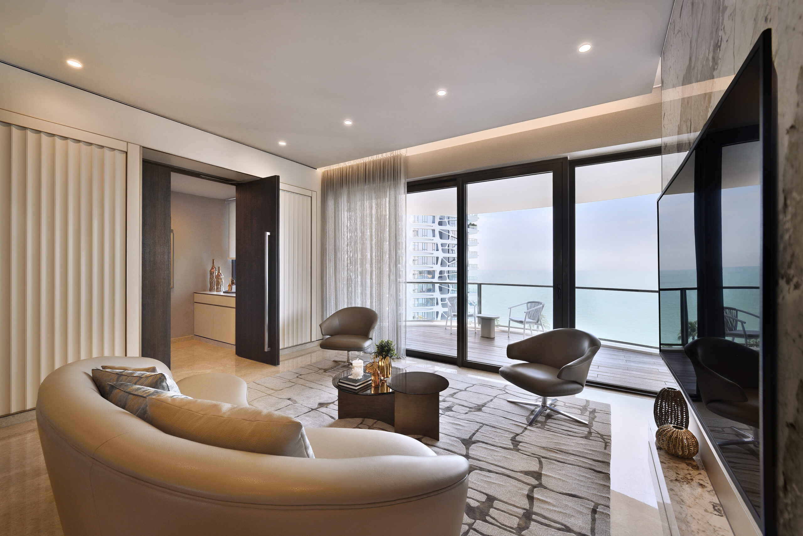 A light colour palette perfectly mimics the coastal backdrop – crisp white and beige shades reminiscent of the sandy beaches flow throughout all rooms. The living area is a study in minimalist elegance, with the curved geometry of the sofa and armchairs inspired by the smooth ridges of seashells. A plush area rug adorned with a ripple effect anchors the space, mirroring the wave-like lines on the room’s feature wall, both bringing to mind the image of gentle ripples of light playing on the water.