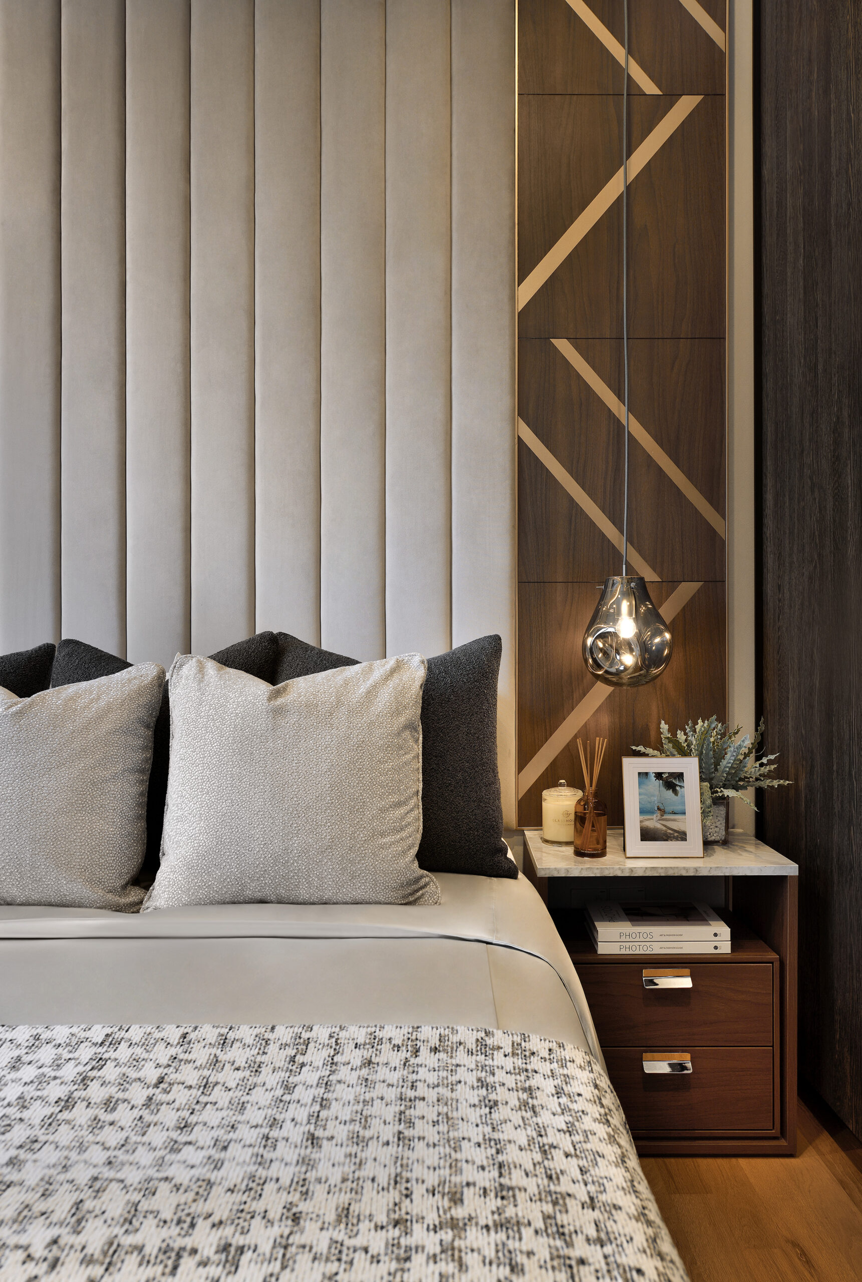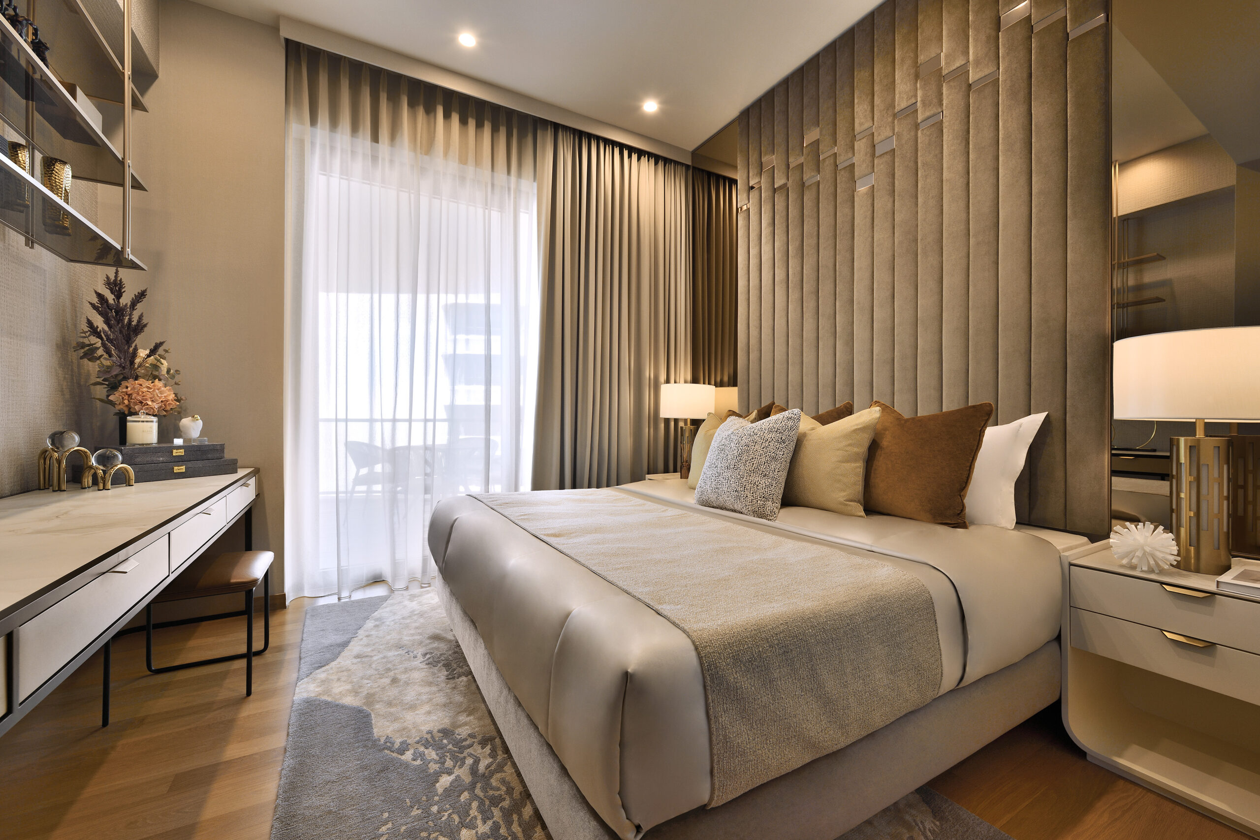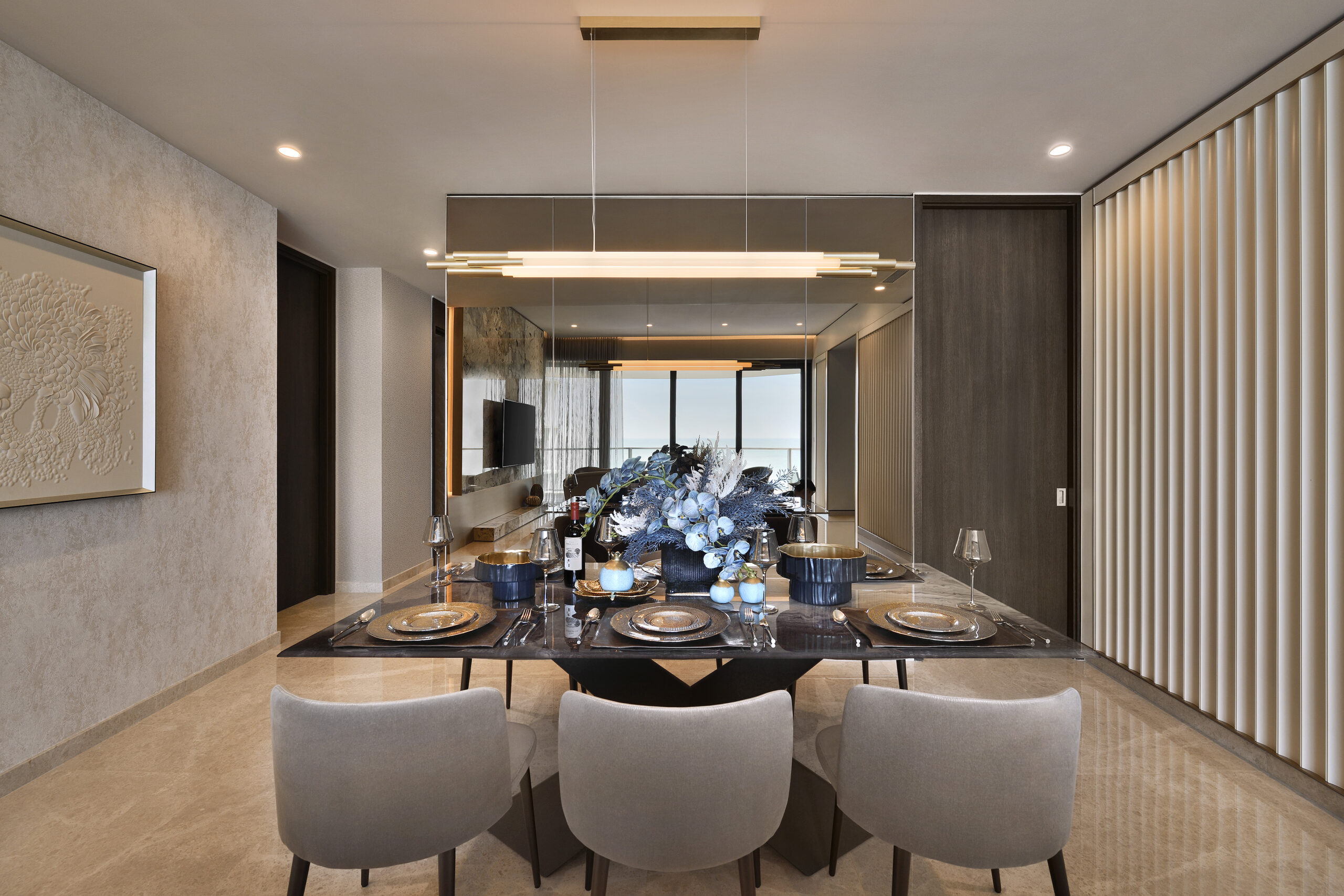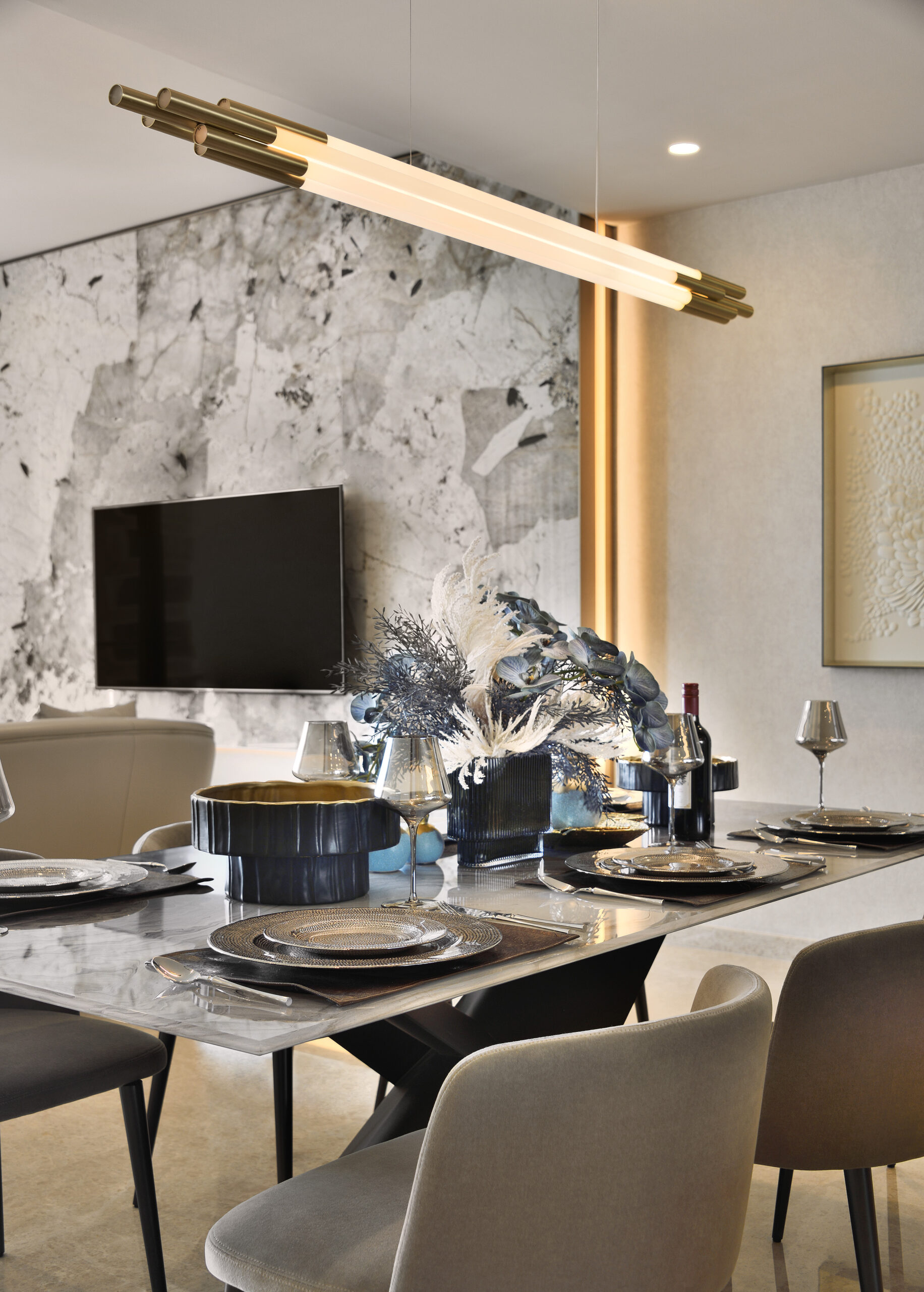A light colour palette perfectly mimics the coastal backdrop – crisp white and beige shades reminiscent of the sandy beaches flow throughout all rooms. The living area is a study in minimalist elegance, with the curved geometry of the sofa and armchairs inspired by the smooth ridges of seashells. A plush area rug adorned with a ripple effect anchors the space, mirroring the wave-like lines on the room’s feature wall, both bringing to mind the image of gentle ripples of light playing on the water.