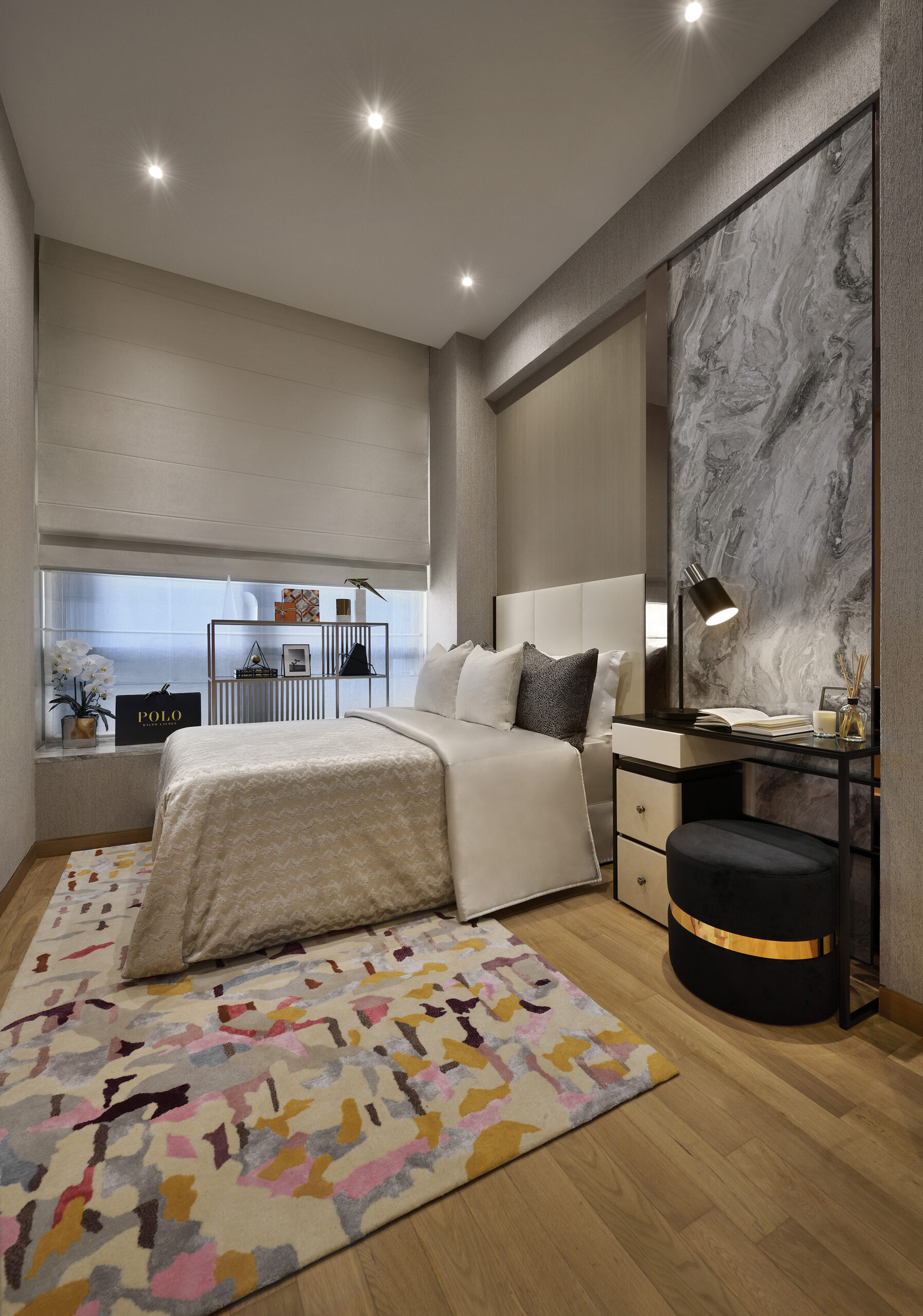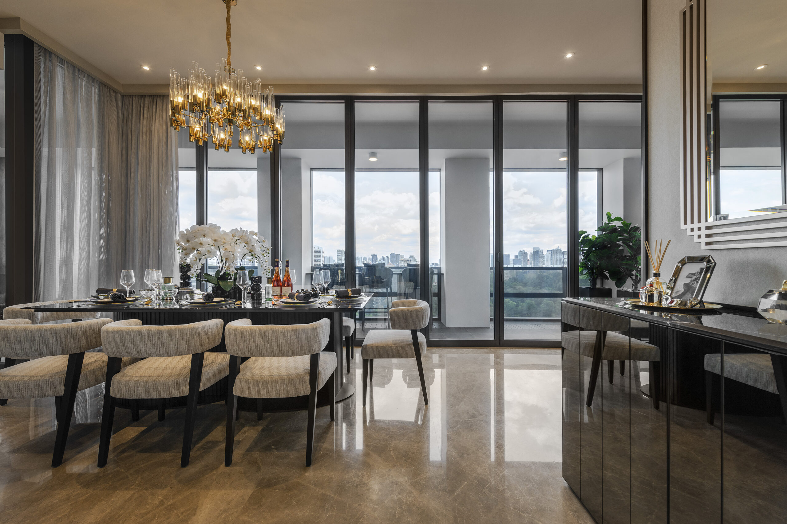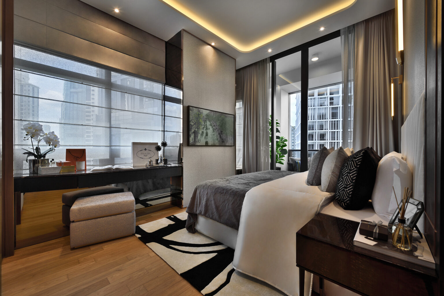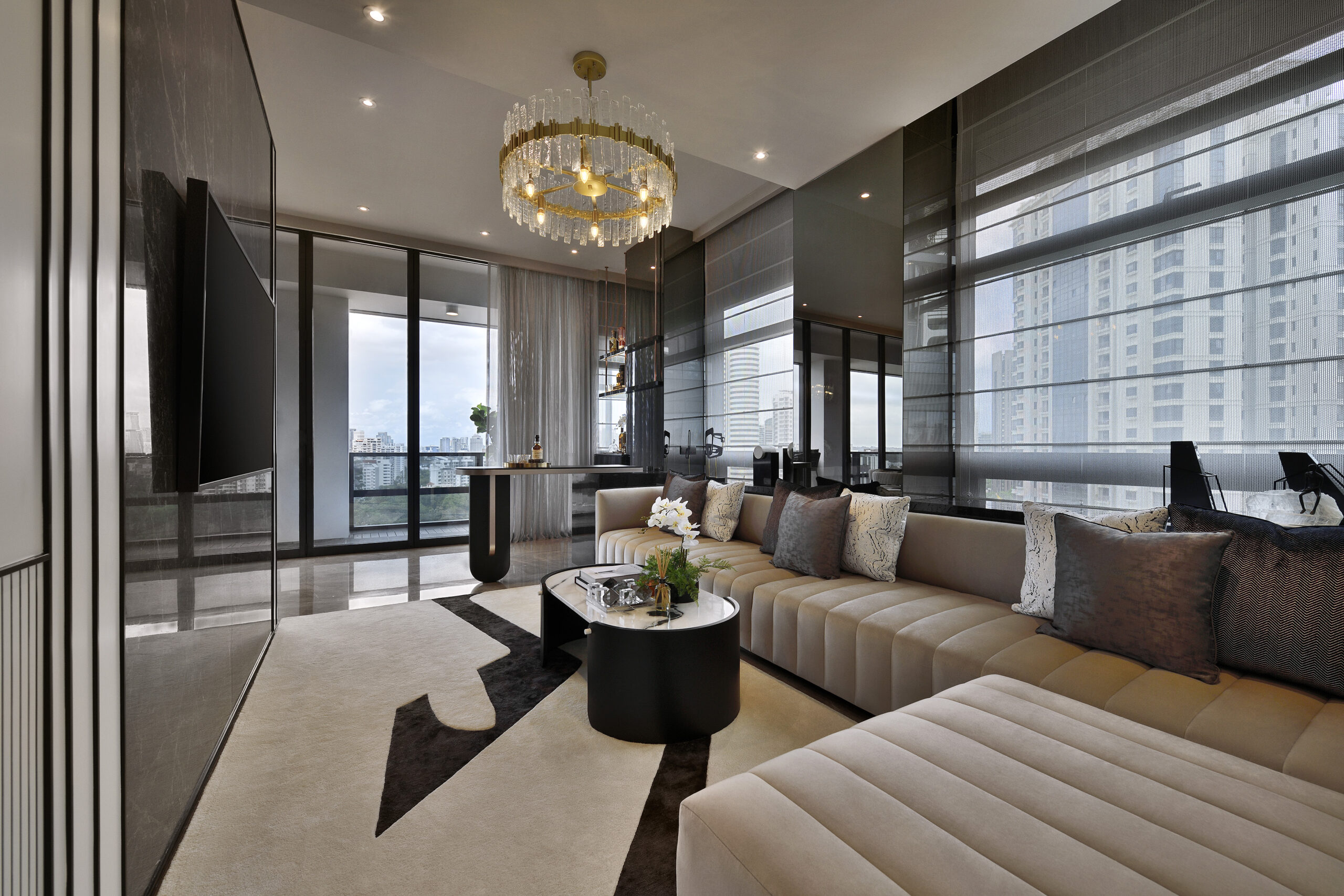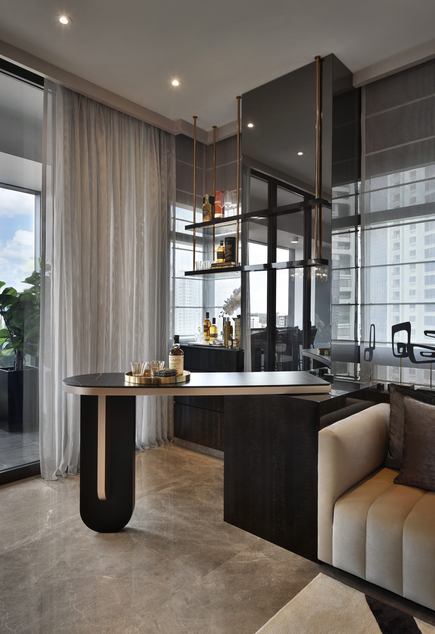 Inside this stunning abode within the Nouvel, we embraced a moodier colour palette to amplify the sense of luxury. Greys and blacks create a cosy ambience that exudes sophistication and comfort, while ivory and cream are used to uplift and brighten.