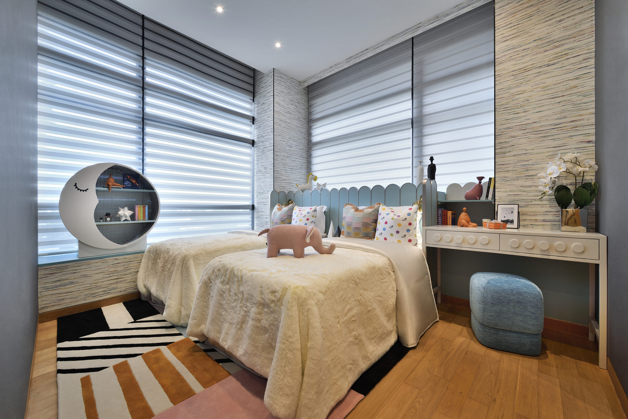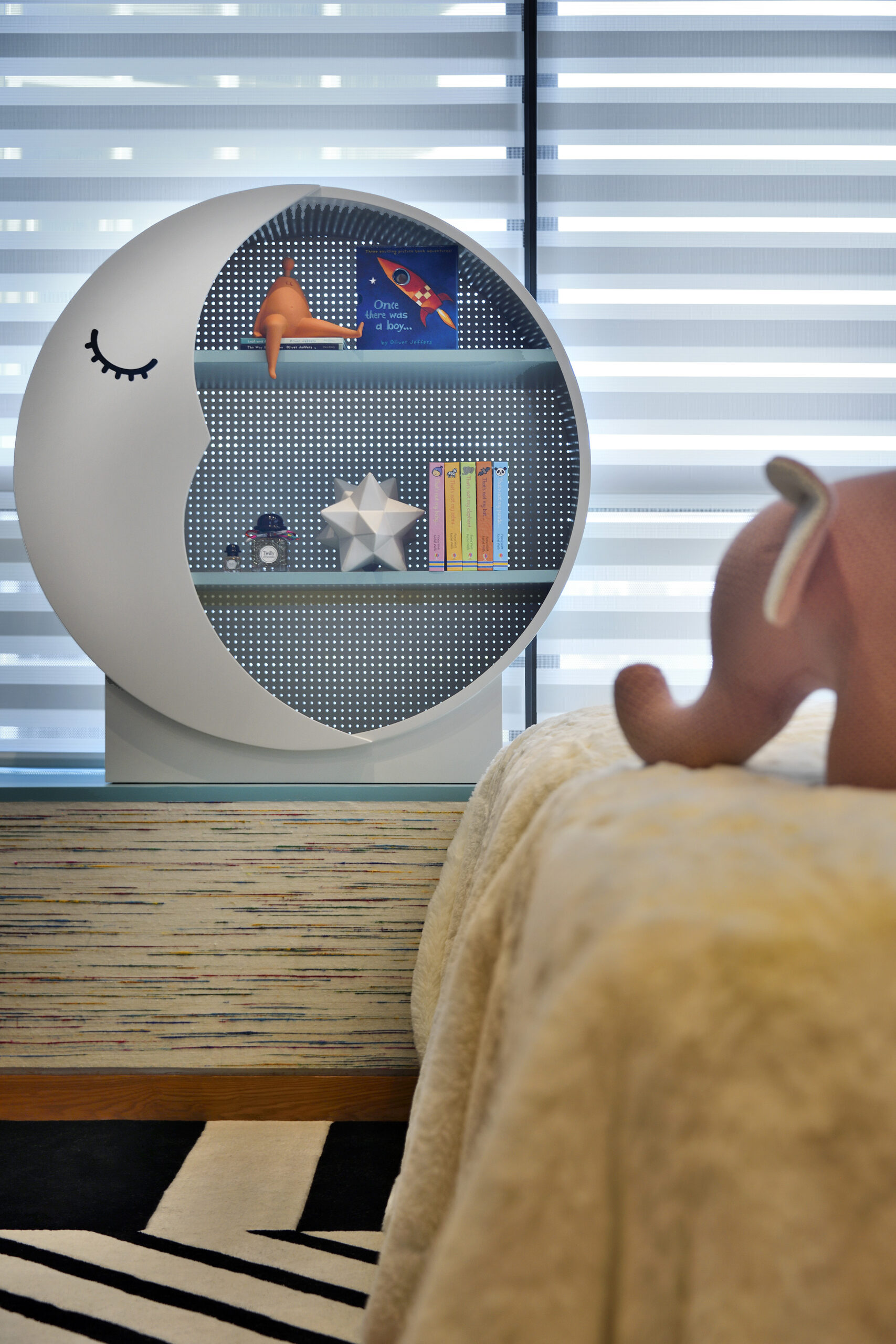 modern alternative to fabric curtains, lifting the mood of the room. A moon-shaped bookcase takes center stage, creating a dreamy atmosphere that ignites a sense of wonder and creativity. Playful patterns on bedding and carpet add to the charm, creating a sanctuary where imaginations soar.