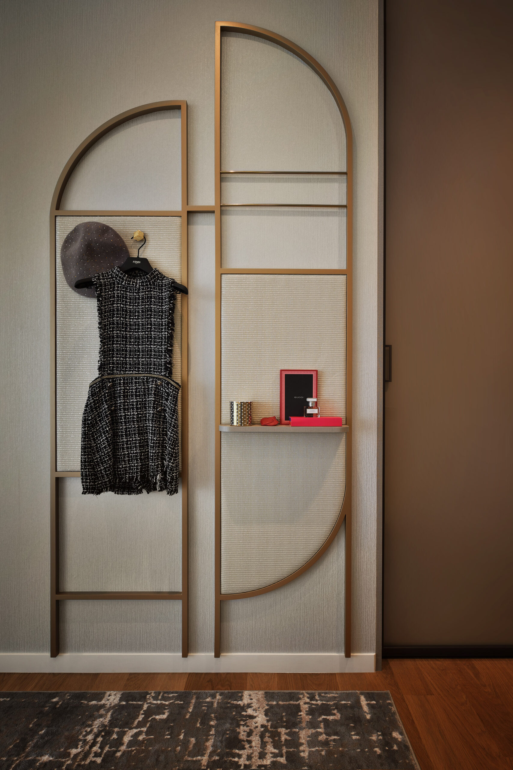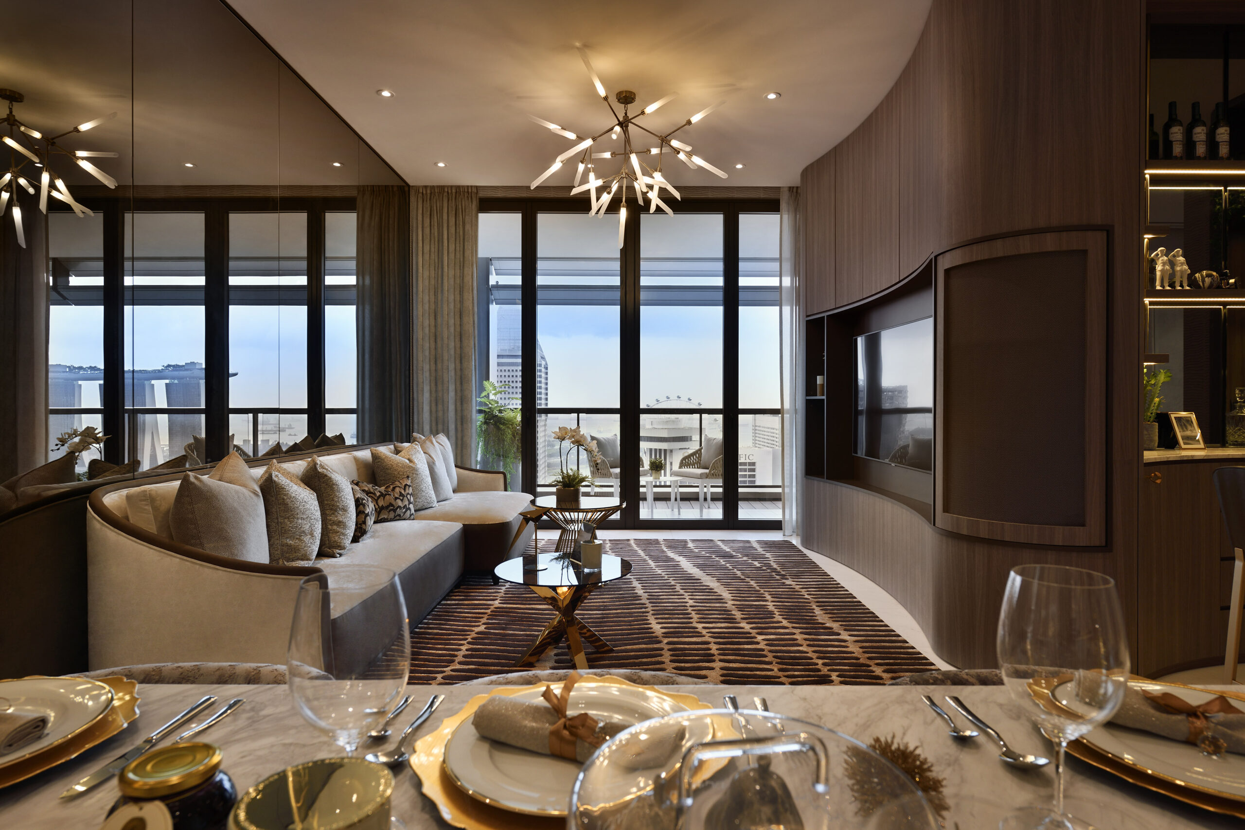 The harmonious serenity between curved lines and sharp edges become more pronounced the deeper you venture into this home. The wall between the living and dining room is designed to be deliberately curvaceous to soften the sharp angles of its original structure. The entertainment wall curves around the living room and melds into a home bar, complete with built-in cabinetry and a wine display case. Rounded chairs surround a rectangular, marble-topped dining table, completing the gentle harmony of contrast.