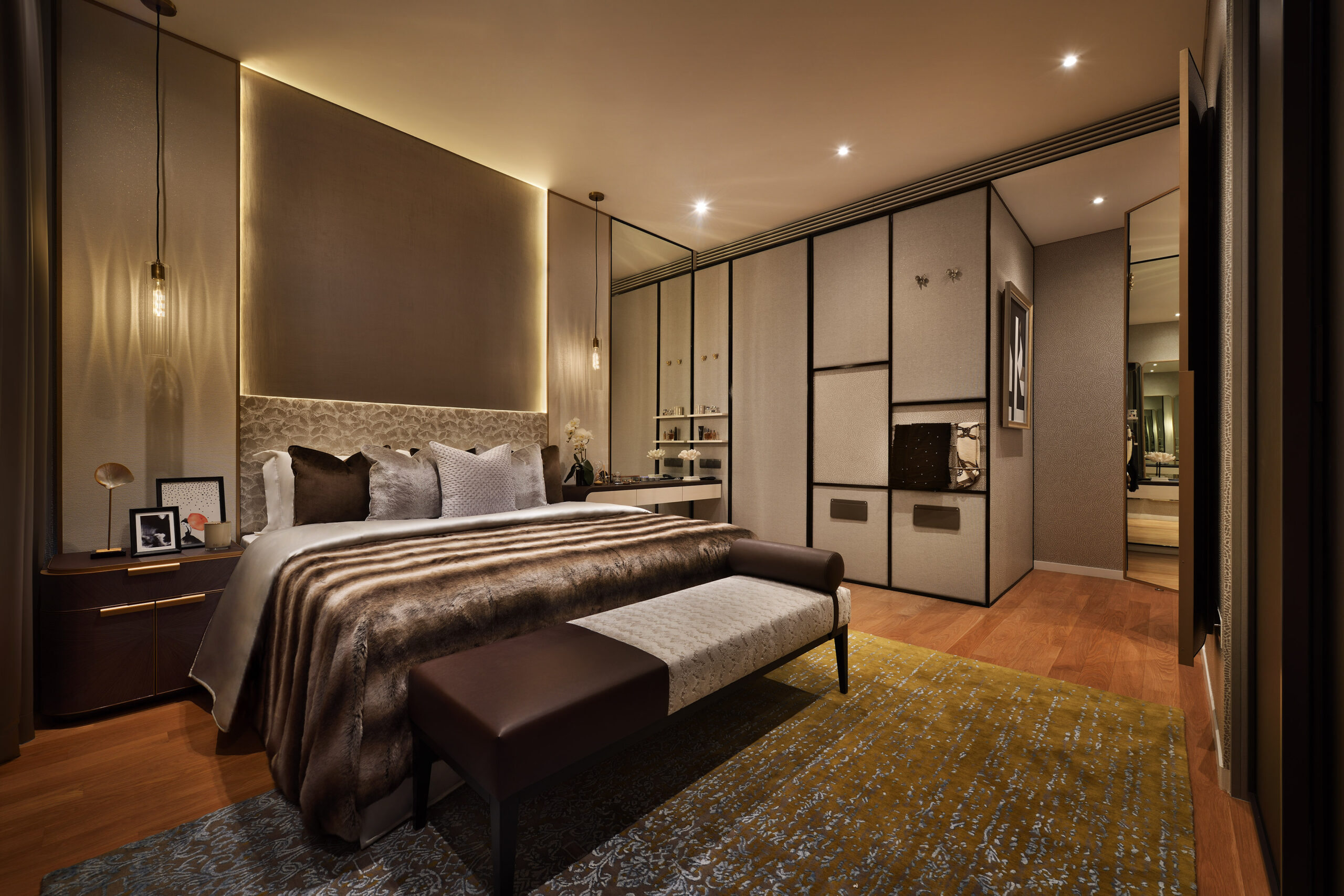 In the bedroom sharp edges and crisp lines are softened by plush linens and textured upholstery. Floor to ceiling windows frame an unobstructed view outside, inviting the city’s skyline to become part of the room’s decor.