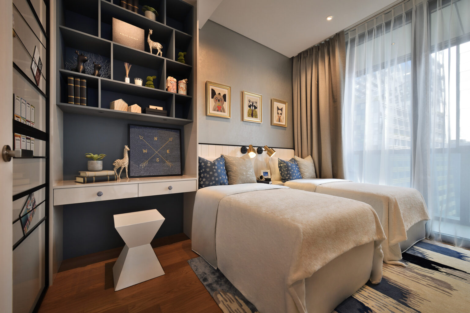 Designed to accentuate the length of the room, the carpet and sofa were both customised to ensure harmony with the space. Upholstered in quality suede, the sofa not only provides a plush seating experience but also serves as the focal anchor against the extended wall and is balanced by the floating wall cabinet facing it. The seamless blend of delicate wainscoting, intricate beadings on the wall panelling and spray-painted panels through the entire house marries sleekness with sophistication. Bespoke twin chandeliers light up the ceiling, its seashell-like pendants inspired by the proximity to the sea.